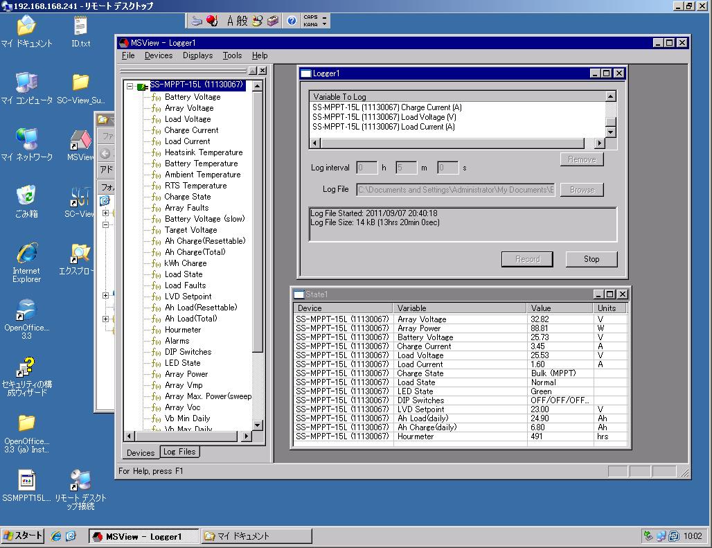 昼間の10:00頃と11:30頃のMSViewの画面です。 11:30から12:00過ぎにかけて本日の発電電力のピークを発生しました。 太陽光発電パネルの定格55Wが2枚という仕様からかなりいいレベルです。 MPPTの効果もあるのでしょう。