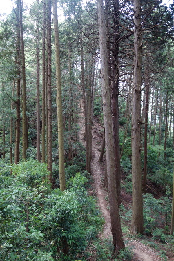 次の大高山に行ってから吾野駅に降りると暗くなってしまいそうだったので、天覚山でエスケープすることにしました。 天覚山山頂から尾根コースと沢コース2つに分かれるうちの沢コースの方をハイスピードで降りていきました。 山道は、笹が生い茂りわかりづらくも見失うことが無い程度でした。