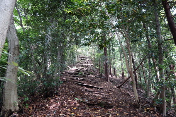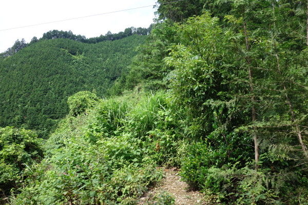 しばらく急登を登ってきてから緩やかな山道にくると、植物が生い茂って不明瞭ですが、踏み跡のある山道を進みます。