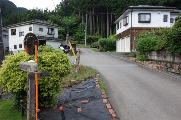 間違ってまっすぐ行ってしまいましたが、右へ降りていきます。 テープに手書きで道標がありました。