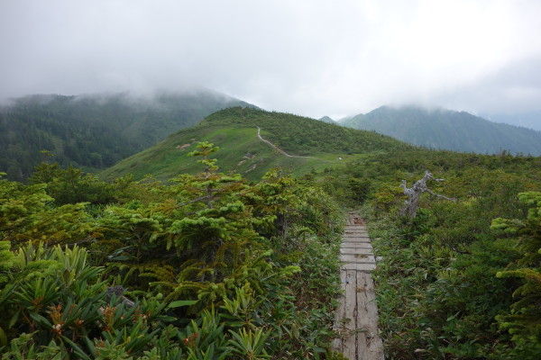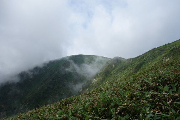 すぐにこの後池ノ岳を降りていきますが、途中で平ヶ岳がみえなくなるところで、手を振ってお別れしました。 こんどいつ来るかわかりませんからね。
