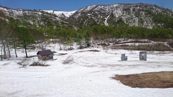 連絡コースを板がはずれないように静かに下る途中に、昨年 苗場山に登った時に利用した駐車場とトイレがみえました。