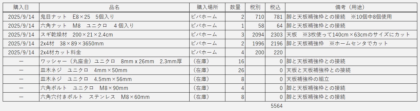 天板については「費用をできるだけ抑える」ことと「人が上に乗れるくらいの頑丈さ?」が要件なので12mm厚のコンパネを2枚重ねで考えていたのですが、ラワン合板24mm厚としても、どちらも天板だけで4、5千円くらいしてしまうのでしばらくの間、製作にとりかかるのを躊躇していました。